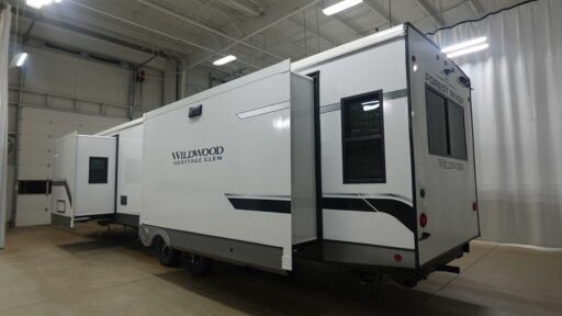 With any Wildwood Heritage Glen travel trailer by Forest River, the quality construction, attention to detail and design along with a bright and welcoming interior allows you to relax in comfort. Each model includes a WeatherShield one piece fiberglass roof, nitrogen-filled radial tires, and an enclosed underbelly with 12V tank heaters on all holding tanks for added protection. You will appreciate the on-demand tankless water heater, along with power stabilizer and tongue jacks, and an extra-large pass-thru storage with slam latch baggage doors. Head inside to enjoy matte gold hardware, wood door casings in place of plastic door casings, and an ultimate interior lighting upgrade with 4k puck/strip lights and a stylish LED back-lit bath mirror!