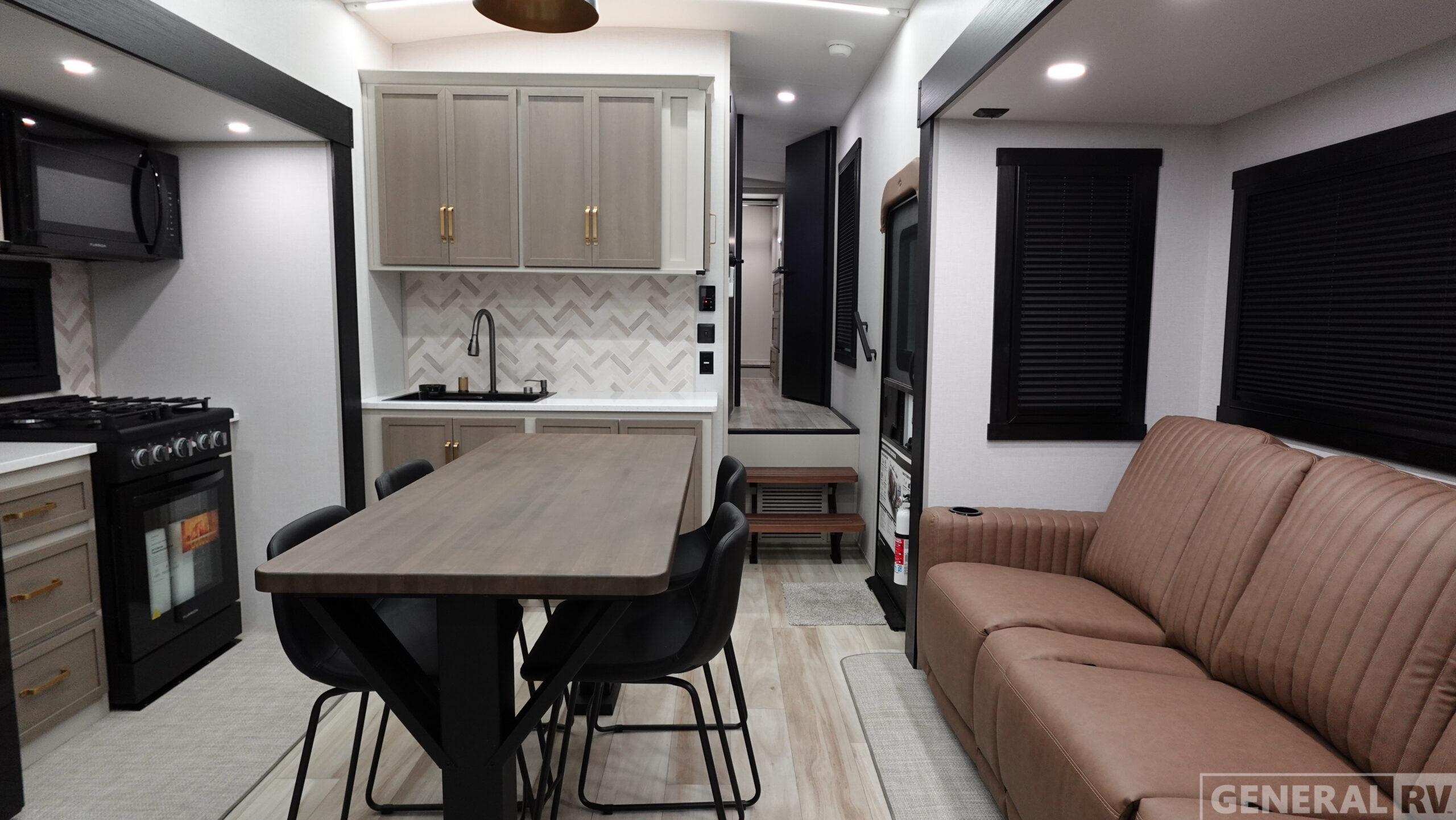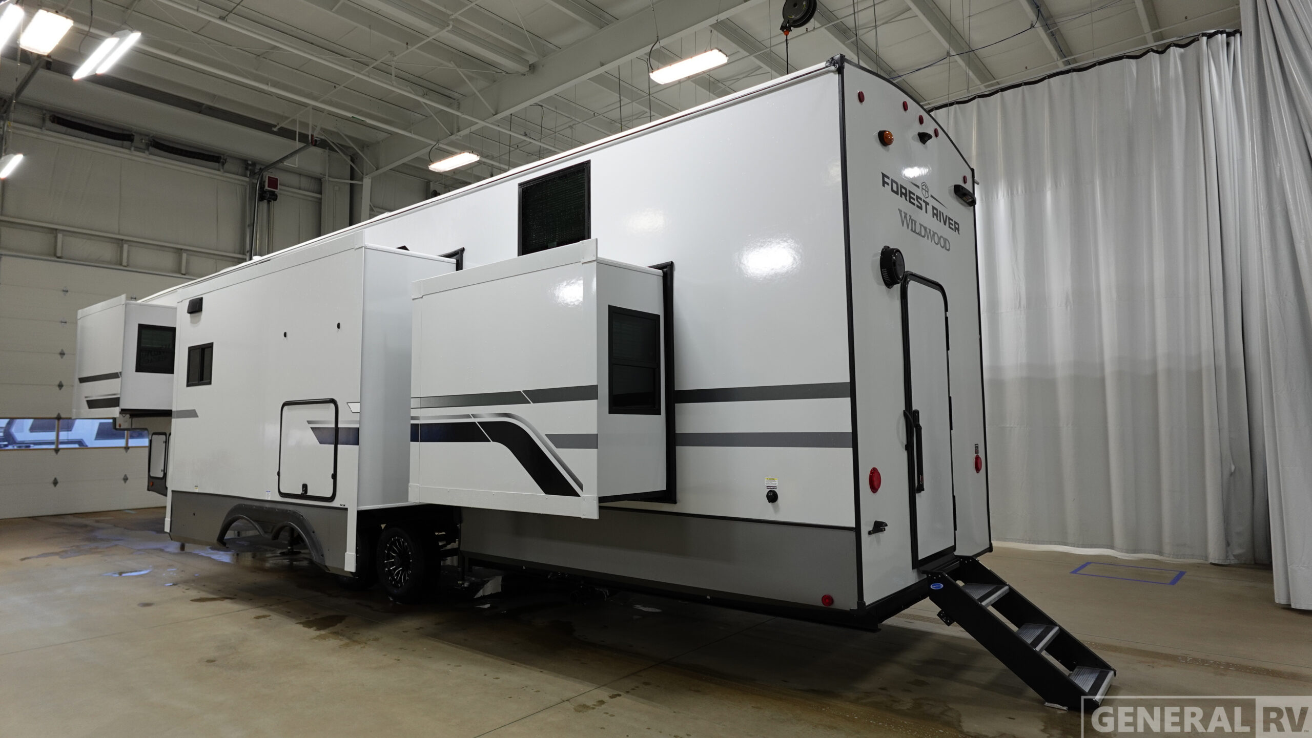 With any Wildwood Heritage Glen fifth wheel by Forest River, the quality construction, attention to detail and design along with a bright and welcoming interior allows you to relax in comfort. You'll love the high-end solid surface countertops included in the Elevated Value Package, along with a JBL sound system, full-length barreled ceilings, and an ultimate interior lighting upgrade. The included Expedition Package features an Accesibelly underbelly panel with 12V tank heaters, nitrogen-filled tires with aluminum rims, and a spacious 30" wide main entry door with a window. The Lippert On-The-Go ladder prep and back-up camera prep let you customize your fifth wheel even more, and the LED awning, front cap, marker and taillights will make it easier than ever to set up camp!