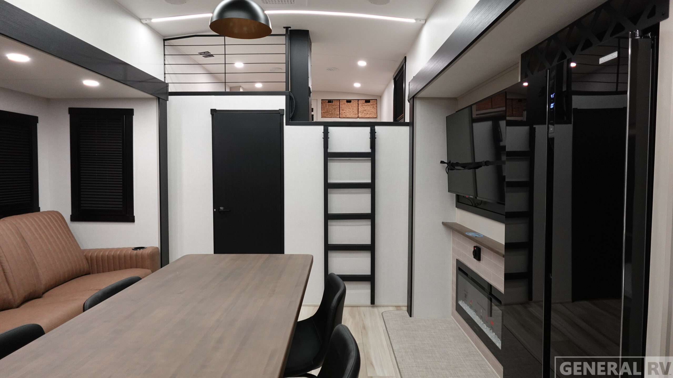 The whole family will love camping in this spacious fifth wheel! There are four slide outs, two bedrooms, plus two full baths, one of which is located in the rear master bedroom. A custom queen bed and dual wardrobes are also found in the master, while a custom king bed is found in the front private bedroom. And the loft with bunk mats can be used for additional sleeping or storage space! The chef of your group will find a full kitchen to cook meals, including ample counter space and a 16-cu. ft. 12V refrigerator and hidden storage behind the 50" TV for snacks or movies. The theater seating with cup holders provides a comfy place to relax each day, and the kitchen island with chairs will be perfect for dining space!