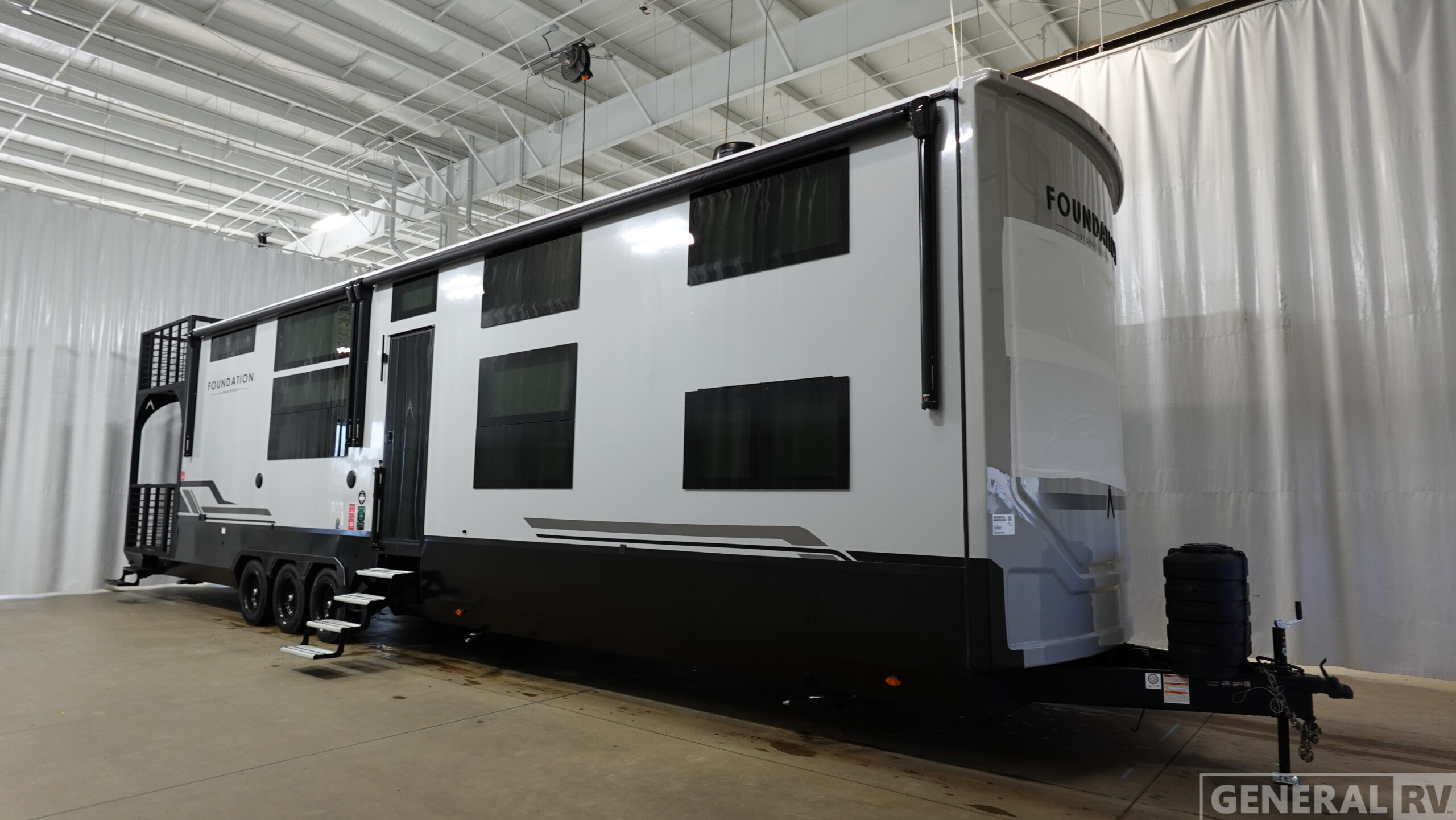 With any Foundation destination trailer by Grand Design, you can choose to stay longer surrounded by residential inspired features! The durable construction includes aluminum framing with a temperature-controlled fiberglass laminated wall, composite exterior decking with waterproof woven vinyl flooring, quad seal protection, and an industry-leading maintenance-less one-piece roof with composite roof decking panels. There is also an exterior convenience center, brass plumbing fittings, an 8' 5" wide body frame, and sleek bonded square glass windows. The interior is packed with residential features, including GE appliances, motorized shades in the living room and kitchen, solid surface countertops in the kitchen and bath, and the list goes on!