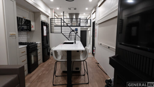 You'll fall in love with this spacious destination trailer that can sleep six each night! With dual entry doors, you can enter in through the rear deck that includes a lower level for gathering, and an observation deck to take in the stars! The other entry door leads into the combined kitchen and living room that includes a spacious kitchen island with a dishwasher, a pull-out pantry, an 18.6 cu. ft. refrigerator and an L-shaped sofa with a trundle bed. There is also an entertainment wall with smart storage and sliding doors that go out to the rear deck. A set of stairs leads to the loft with a queen-size sleeping pad, ample storage space, plus a table with a foot nook so you can put the table away when not in use. Back downstairs, a full bath will let you freshen up each day and a front private bedroom with a king bed slide is sure to bring comfort. There is also storage space for your things, a telescoping TV, plus washer and dryer prep if you plan to add these appliances!