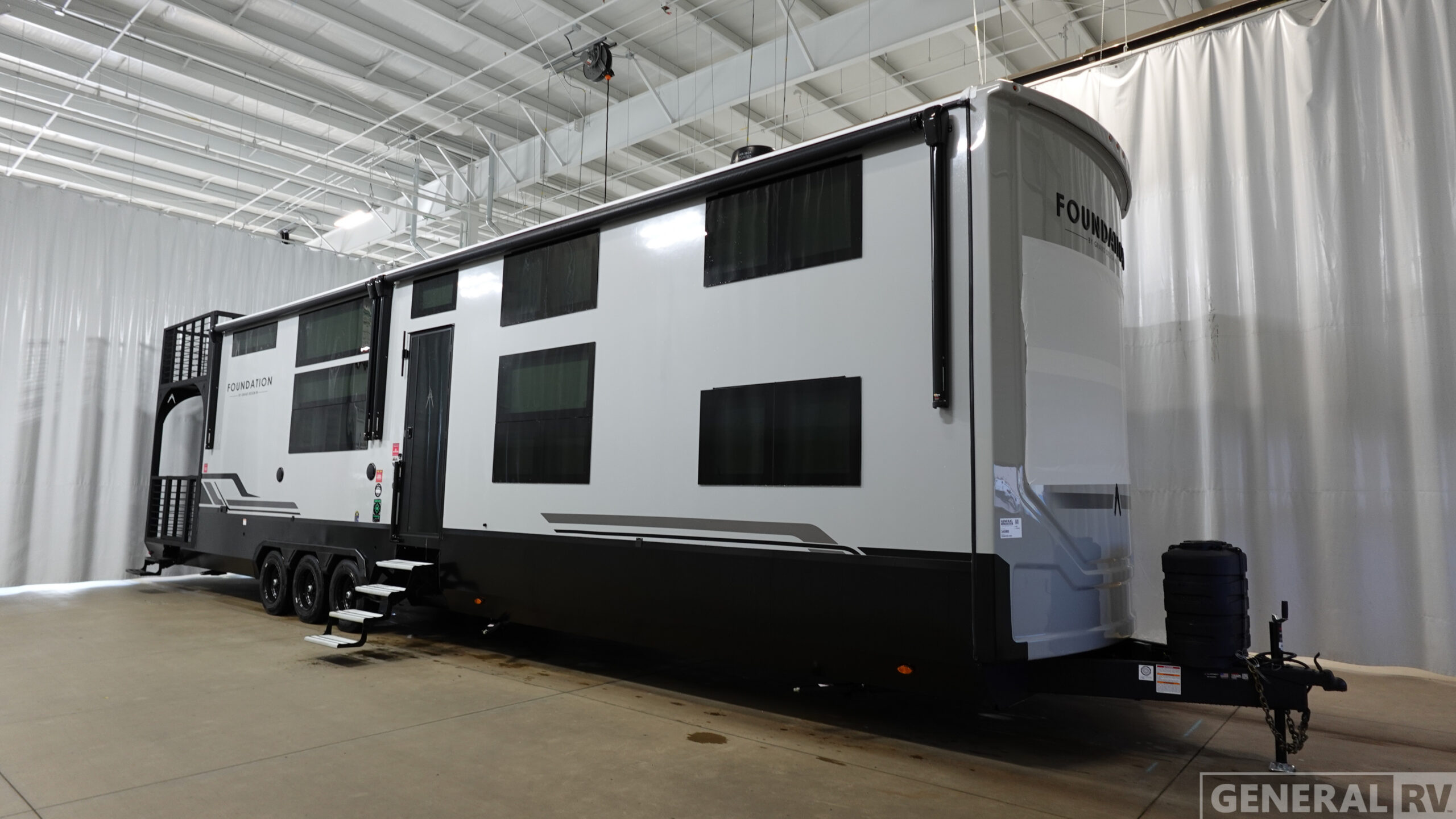 With any Foundation destination trailer by Grand Design, you can choose to stay longer surrounded by residential inspired features! The durable construction includes aluminum framing with a temperature-controlled fiberglass laminated wall, composite exterior decking with waterproof woven vinyl flooring, quad seal protection, and an industry-leading maintenance-less one-piece roof with composite roof decking panels. There is also an exterior convenience center, brass plumbing fittings, an 8' 5" wide body frame, and sleek bonded square glass windows. The interior is packed with residential features, including GE appliances, motorized shades in the living room and kitchen, solid surface countertops in the kitchen and bath, and the list goes on!