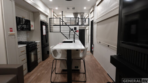 You'll fall in love with this spacious destination trailer that can sleep six each night! With dual entry doors, you can enter in through the rear deck that includes a lower level for gathering, and an observation deck to take in the stars! The other entry door leads into the combined kitchen and living room that includes a spacious kitchen island with a dishwasher, a pull-out pantry, an 18.6 cu. ft. refrigerator and an L-shaped sofa with a trundle bed. There is also an entertainment wall with smart storage and sliding doors that go out to the rear deck. A set of stairs leads to the loft with a queen-size sleeping pad, ample storage space, plus a table with a foot nook so you can put the table away when not in use. Back downstairs, a full bath will let you freshen up each day and a front private bedroom with a king bed slide is sure to bring comfort. There is also storage space for your things, a telescoping TV, plus washer and dryer prep if you plan to add these appliances!