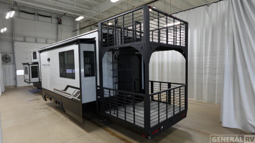 With any Foundation destination trailer by Grand Design, you can choose to stay longer surrounded by residential inspired features! The durable construction includes aluminum framing with a temperature-controlled fiberglass laminated wall, composite exterior decking with waterproof woven vinyl flooring, quad seal protection, and an industry-leading maintenance-less one-piece roof with composite roof decking panels. There is also an exterior convenience center, brass plumbing fittings, an 8' 5" wide body frame, and sleek bonded square glass windows. The interior is packed with residential features, including GE appliances, motorized shades in the living room and kitchen, solid surface countertops in the kitchen and bath, and the list goes on!