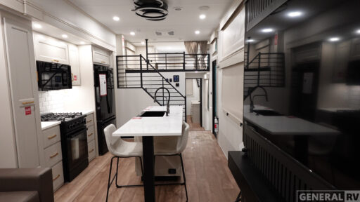 You'll fall in love with this spacious destination trailer that can sleep six each night! With dual entry doors, you can enter in through the rear deck that includes a lower level for gathering, and an observation deck to take in the stars! The other entry door leads into the combined kitchen and living room that includes a spacious kitchen island with a dishwasher, a pull-out pantry, an 18.6 cu. ft. refrigerator and an L-shaped sofa with a trundle bed. There is also an entertainment wall with smart storage and sliding doors that go out to the rear deck. A set of stairs leads to the loft with a queen-size sleeping pad, ample storage space, plus a table with a foot nook so you can put the table away when not in use. Back downstairs, a full bath will let you freshen up each day and a front private bedroom with a king bed slide is sure to bring comfort. There is also storage space for your things, a telescoping TV, plus washer and dryer!