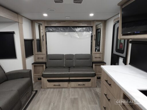 The Imagine XLS 17MKE is equipped with a mid-size refrigerator powered by electric or propane, and a three-burner cooktop, ensuring your culinary needs are met wherever you roam. Relax under the expansive 14-foot powered retractable awning, perfect for enjoying the great outdoors in comfort. The theater dinette, with an optional U-shaped configuration, provides a cozy spot for meals or movie nights. With ample storage, including unobstructed pass-thru storage and convenient interior drawers, you can bring along all your essentials for the journey. Visit your nearest General RV dealership to explore this impressive model and start your next adventure.