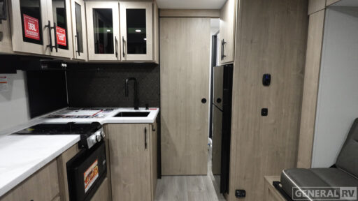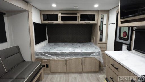 At the rear, the bathroom combines functionality with elegance, featuring a sleek plastic and glass shower. The queen bed promises restful nights, while the powered retractable awning extends your living space outdoors, creating the perfect spot for relaxation under the stars. With a generous fresh water capacity of 37 gallons and ample storage, including unobstructed pass-thru storage, this RV is ready for your next adventure. For more details, visit your nearest General RV dealership.