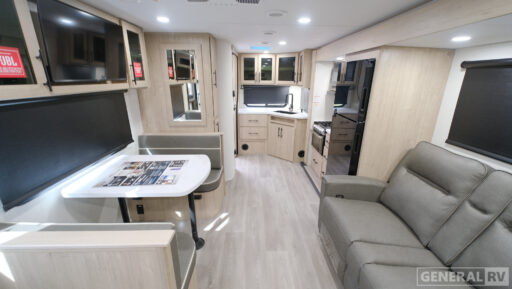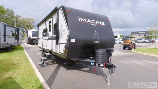 The heart of this RV is the thoughtfully designed kitchen, equipped with a mid-size refrigerator and a three-burner cooktop, perfect for whipping up your favorite meals on the road. Enjoy your culinary creations in the booth dinette or relax in the plush theater seating, all under the expansive 18-foot powered retractable awning that extends your living space outdoors. With ample storage, including an unobstructed pass-thru compartment, and a universal docking station, the Imagine XLS 22MLE ensures that every journey is both convenient and memorable. For more details, visit your nearest General RV dealership and embark on your next adventure in style.