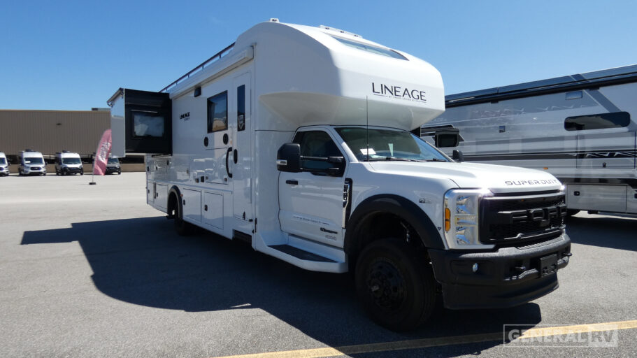 The capable Lineage Series F Super C diesel motorhome by Grand Design is your ticket to adventure! There is a Fox Factory Suspension Package for optimal handling, and you can go off the beaten path with the 6.7L power stroke diesel 4x4 chassis. This coach sits on the Ford F-600 super duty platform, and features a MorRyde tubular steel frame for added strength and durability. You'll find many at-home comforts inside, including comfortable seating and sleeping spaces, full bath and kitchen amenities, and plenty of storage for your personal belongings and camp gear!