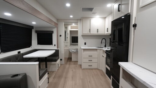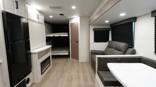 Inside, the open layout sleeps up to 8 with a front bedroom, convertible furniture, and garage bunks, making it ideal for families or group travel. The well-equipped kitchen offers a refrigerator, three-burner cooktop, microwave, and ample storage for easy meal prep on the road.