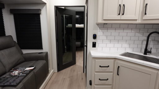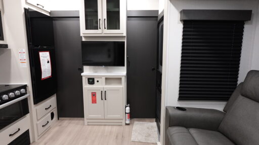 Inside, the center kitchen and living area offer a seamless flow, featuring a mid-size refrigerator powered by electric or propane, and a three-burner cooktop that invites culinary creativity. The theater seating provides a perfect spot to relax, while the full-size and queen beds ensure a restful night’s sleep for up to six guests. The front bedroom offers privacy and tranquility, with ample storage for all your essentials. With an 18-foot powered retractable awning, you can enjoy the great outdoors in style, making every destination feel like home.