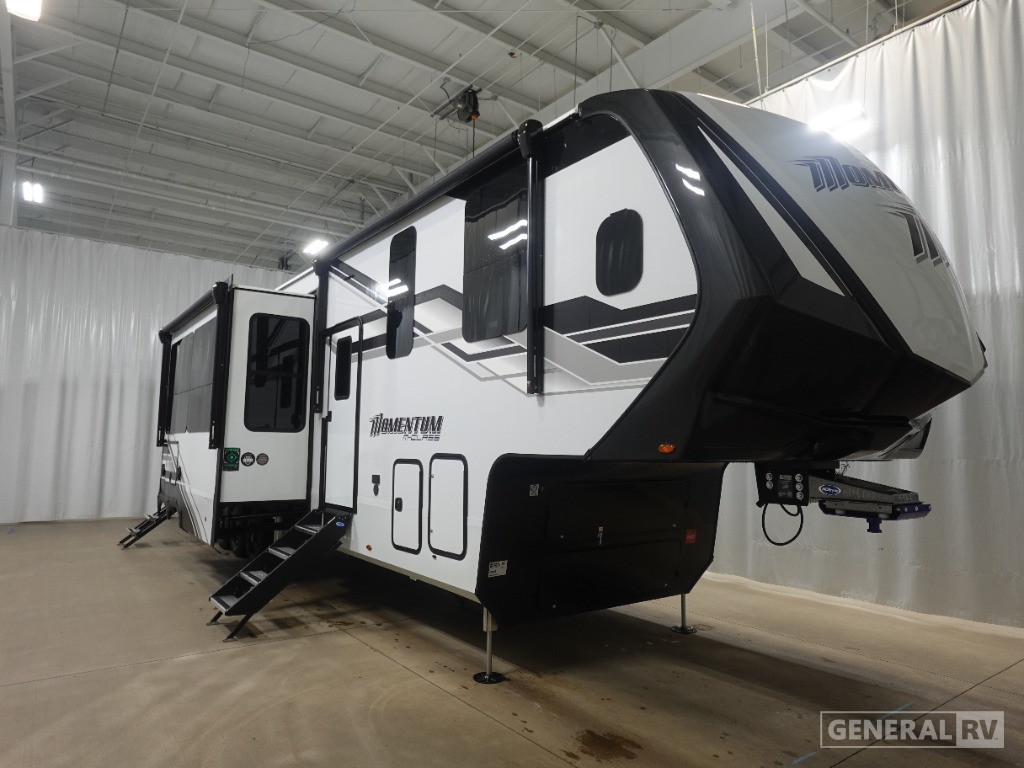 With any Momentum M-Class toy hauler by Grand Design, you will enjoy luxury at every turn! They have been constructed to a superior standard with a thermal roof design, triple insulated main floor and garage floor, and a Rail-Tite underbelly seal that will allow you to camp in all elements. Each model also features an 8' 5" wide body chassis with a wide rail design, no wheel wheels, and a dovetail entry for easier loading. The Stealth A/C system provides maximum cooling power, and the CRE3000 suspension system means you can enjoy a smooth tow each time. You will love the luxurious interior with a professional grade stainless steel cooktop, interior color changing LED accent lighting, a fiberglass shower with a glass door, and solid surface countertops.