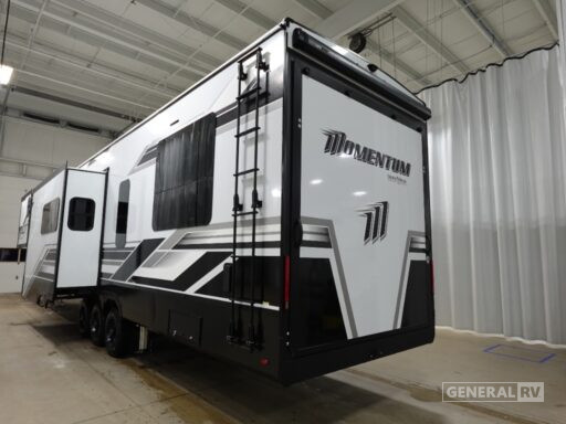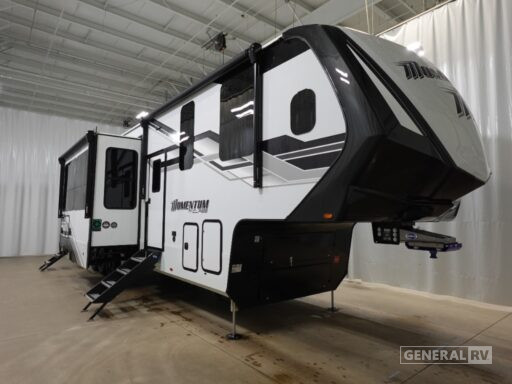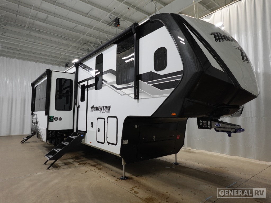 With any Momentum M-Class toy hauler by Grand Design, you will enjoy luxury at every turn! They have been constructed to a superior standard with a thermal roof design, triple insulated main floor and garage floor, and a Rail-Tite underbelly seal that will allow you to camp in all elements. Each model also features an 8' 5" wide body chassis with a wide rail design, no wheel wheels, and a dovetail entry for easier loading. The Stealth A/C system provides maximum cooling power, and the CRE3000 suspension system means you can enjoy a smooth tow each time. You will love the luxurious interior with a professional grade stainless steel cooktop, interior color changing LED accent lighting, a fiberglass shower with a glass door, and solid surface countertops.