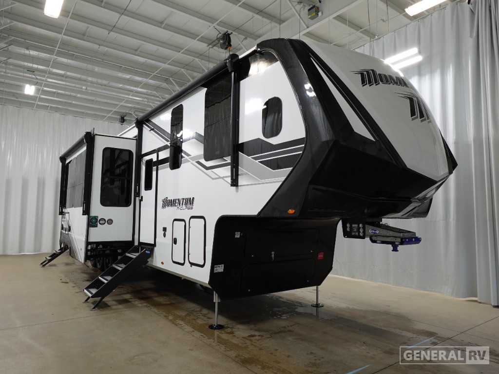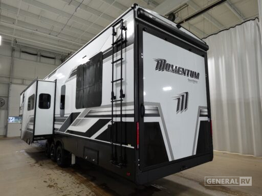 With any Momentum M-Class toy hauler by Grand Design, you will enjoy luxury at every turn! They have been constructed to a superior standard with a thermal roof design, triple insulated main floor and garage floor, and a Rail-Tite underbelly seal that will allow you to camp in all elements. Each model also features an 8' 5" wide body chassis with a wide rail design, no wheel wheels, and a dovetail entry for easier loading. The Stealth A/C system provides maximum cooling power, and the CRE3000 suspension system means you can enjoy a smooth tow each time. You will love the luxurious interior with a professional grade stainless steel cooktop, interior color changing LED accent lighting, a fiberglass shower with a glass door, and solid surface countertops.