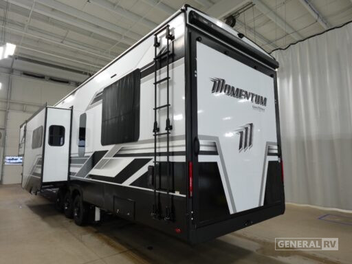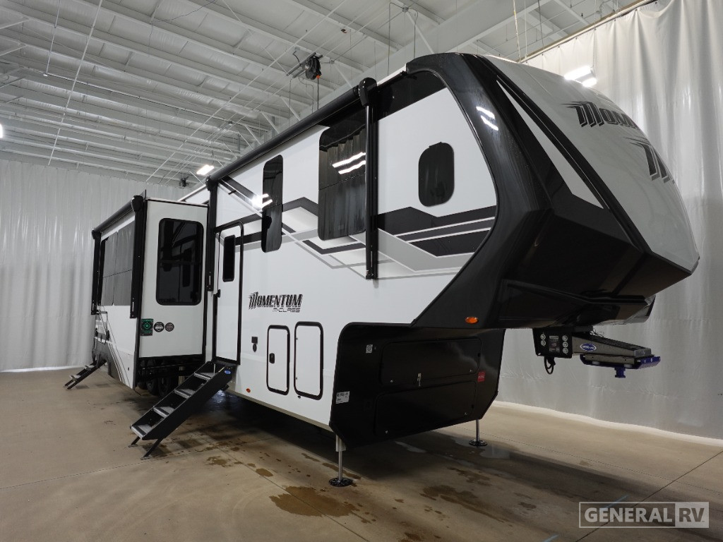 With any Momentum M-Class toy hauler by Grand Design, you will enjoy luxury at every turn! They have been constructed to a superior standard with a thermal roof design, triple insulated main floor and garage floor, and a Rail-Tite underbelly seal that will allow you to camp in all elements. Each model also features an 8' 5" wide body chassis with a wide rail design, no wheel wheels, and a dovetail entry for easier loading. The Stealth A/C system provides maximum cooling power, and the CRE3000 suspension system means you can enjoy a smooth tow each time. You will love the luxurious interior with a professional grade stainless steel cooktop, interior color changing LED accent lighting, a fiberglass shower with a glass door, and solid surface countertops.
