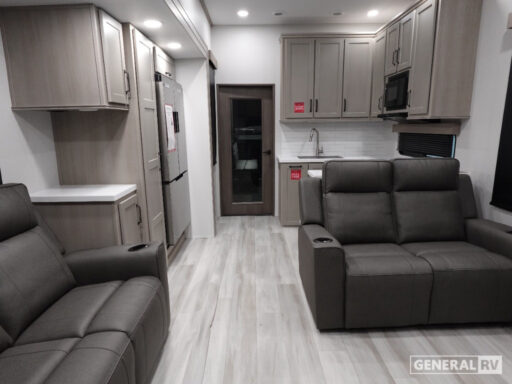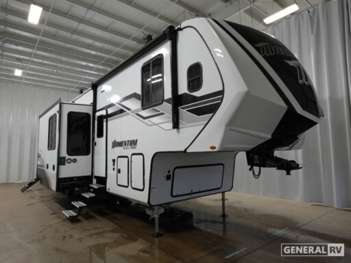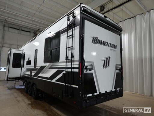 The Momentum G-Class 415G is built for both relaxation and entertainment. The center living area features plush theater seating, perfect for enjoying a movie night or simply lounging with your favorite book. The 14-foot garage not only provides ample storage for your toys but also transforms into additional living space with a rollover sofa. Enjoy the great outdoors with the 12-foot powered retractable awning, offering shade and comfort. With a robust fresh water capacity of 98 gallons and a GVWR of 20,000 lbs, this RV is ready for extended adventures. For more information or to experience this model firsthand, visit your nearest General RV dealership.
