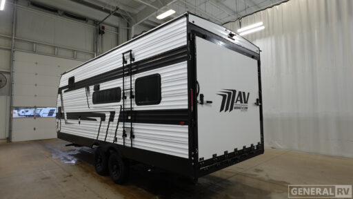 Inside, you'll find accommodations for up to six people with two queen beds and a convertible bed, ensuring everyone has a comfortable place to rest. The kitchen is equipped with a mid-size electric refrigerator and a three-burner cooktop, ready to handle all your culinary needs. Enjoy the convenience of the 17-foot powered retractable awning, providing shade and comfort as you unwind outside. With a fresh water capacity of 90 gallons and ample gray and black water storage, the Momentum MAV 22MAV is designed for extended journeys. Visit your nearest General RV dealership to discover more about this exceptional travel companion.