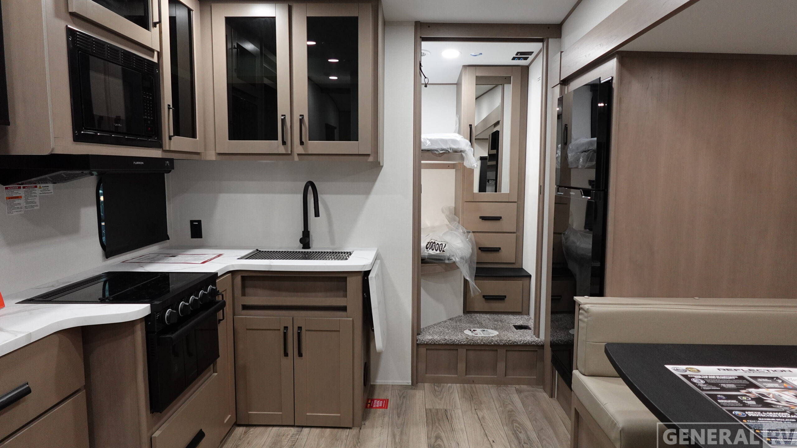 Each Reflection 100 Series fifth wheel by Grand Design is affordable and packed with luxury for unforgettable camping memories! The MorRyde CRE3000 suspension system and Goodyear Endurance tires will provide smooth towing from home to campground. And the solar package with a 180W solar panel, 60 Amp charge controller and 12V refrigerator will allow you to camp for longer periods of time and in more locations! A heated and enclosed underbelly with circulating heat is included in the Arctic 4-Seasons Protection Package, along with a double insulated roof and front cap, and thermofoil insulation under the holding tanks so you can camp all year long if you choose. You will appreciate having an on-demand water heater for hot showers after exploring, and the universal all-in-one docking station will let you monitor your RVs tanks levels and functions with ease. These models also include many luxurious interior features, such as premium Congoleum flooring, pleated shades, residential cabinetry, and matte black fixtures and hardware. Don't let the Reflection 100 Series fifth wheels pass you by!