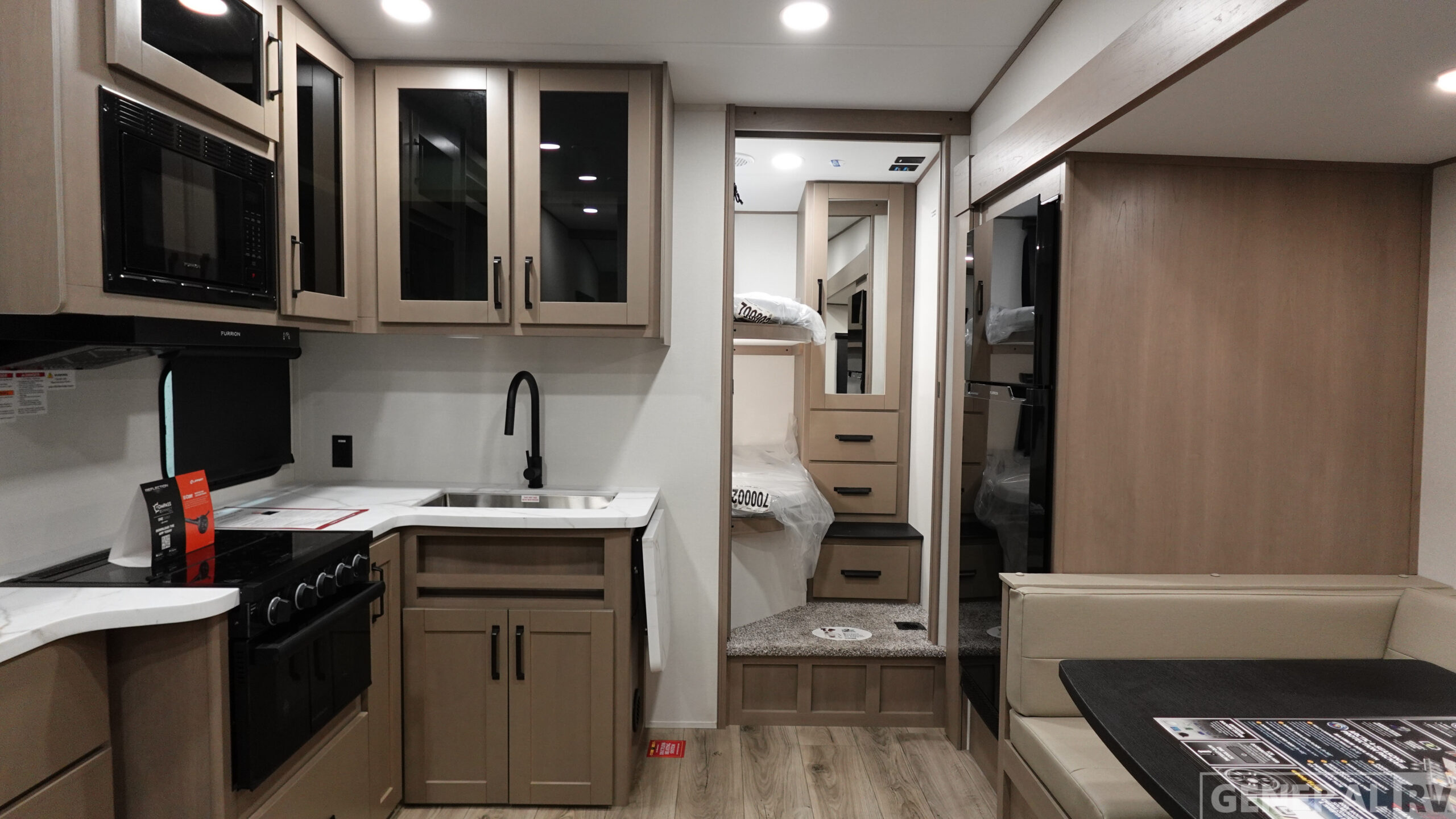 Camping with friends and family just got a whole lot easier in this fifth wheel with double-size bunks and a front private bedroom. Your guests will also have a wardrobe to keep their things tidy, and the bedroom closet will be perfect for your things. If you have other guests stay over, they can sleep on the U-shaped dinette within the slide out or the tri-fold sofa, and there is a 40" high-definition LED TV here to keep everyone entertained on rainy days. Everyone can take turns cleaning up in the full bath that includes a residential walk-in shower, a power vent fan, plus a large vanity top with a deep sink. And you will feel right at home in the front private bedroom with its queen bed, overhead cabinets, and TV prep if you'd like to add a television!