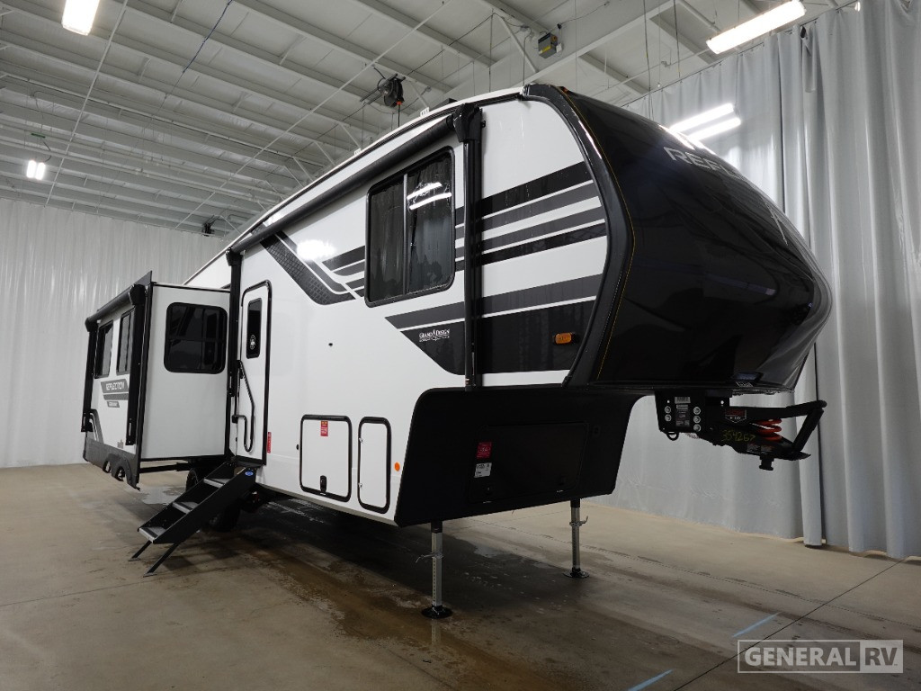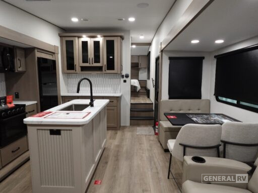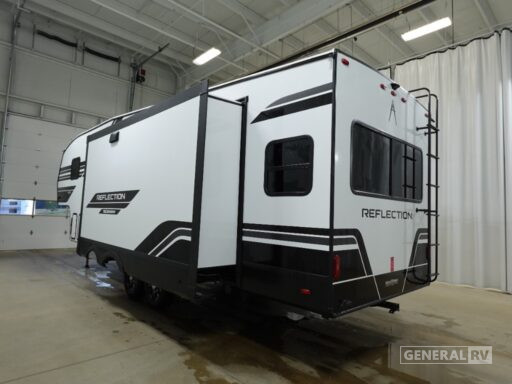 The front bedroom is your private sanctuary, boasting a cozy queen bed and ample storage space. The center bath is thoughtfully designed with a stylish plastic and glass shower. With two powered retractable awnings, you can extend your living space outdoors and enjoy the fresh air. The Reflection 150 Series is not only about comfort but also practicality, with generous fresh, gray, and black water capacities, ensuring your adventures are uninterrupted. Discover the ultimate travel companion at your nearest General RV dealership.