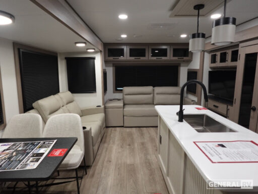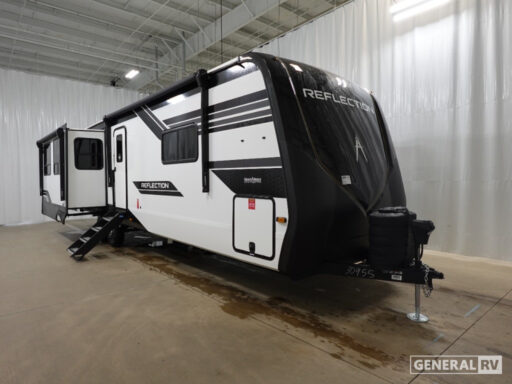 The master suite offers a serene retreat with a queen bed, ample storage, and washer/dryer prep for added convenience. The bathroom, with its 30x36-inch shower, ensures you have all the comforts of home on the road. Outside, two electric LED awnings provide the perfect space for outdoor relaxation. With a robust 54-gallon fresh water capacity and on-demand tankless water heater, your journeys will be both comfortable and carefree. Visit your nearest General RV dealership to explore the Reflection 345RLTS and start your adventure in style!