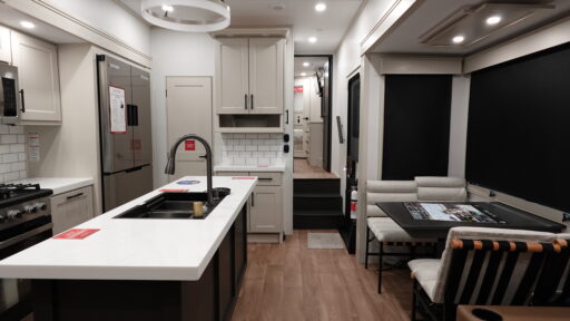 Retreat to the front bedroom where a plush queen bed awaits, with the option to upgrade to a king for even more comfort. The center bath offers convenience and privacy, complete with a shower enclosed in sleek plastic and glass. With ample storage throughout, including a slide-top dresser and pass-thru storage, all your essentials are easily accommodated. The Solitude 310GK is also washer/dryer prepped, adding to its long list of conveniences. With two powered retractable awnings and an optional pull-out kitchen, outdoor living is as enjoyable as being inside. Ready to elevate your travel experience? Visit your nearest General RV Dealership to explore this exceptional RV firsthand.