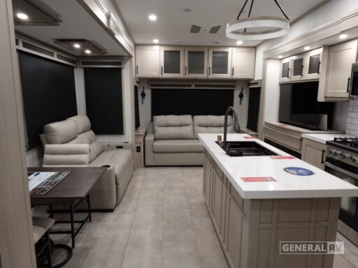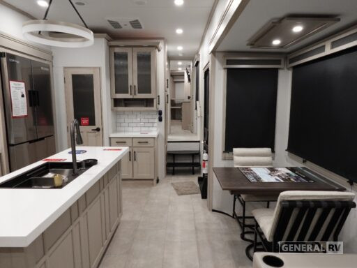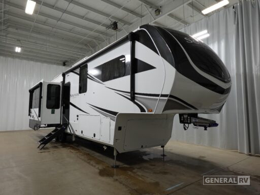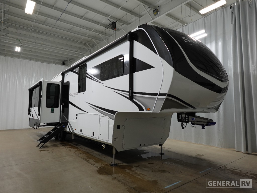 Retreat to the front bedroom, where a plush king bed awaits. The thoughtful design includes a center bath for easy access, and ample storage throughout ensures you have room for all your essentials. The Solitude 370DV is washer and dryer prepped, offering the convenience of home even on the road. With a substantial fresh water capacity of 81 gallons and two powered retractable awnings, this RV is perfectly equipped for extended stays. Whether you’re parked at a campsite or exploring the open road, the Solitude 370DV promises a travel experience like no other. For more details and to see it in person, visit your nearest General RV Dealership.