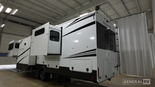 Each Solitude fifth wheel by Grand Design features a 101" wide-body construction, heavy duty 8,000 lb. axles, frameless tinted windows, and high-gloss gel coat sidewalls. You can camp year around thanks to the Weather-Tek Package that includes a 35K BTU high-capacity furnace, an all-in-one enclosed and heated utility center, and a fully enclosed underbelly with heated tanks and storage. Inside, you'll love the premium roller shades, hardwood cabinet doors, solid surface countertops, plus residential finishes throughout to make you truly feel at home. Each model also includes a MORryde CRE3000 suspension system, self adjusting brakes, and a MORryde pin box that will provide smooth towing from home to campground. Affordable luxury is possible with the Solitude fifth wheels; choose yours today!