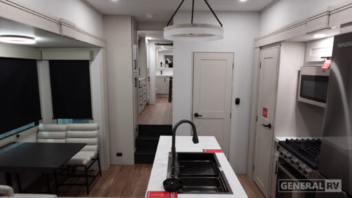 Dual-Sink Vanity Full and Half Bath Separate Front Living Area Kitchen Island Exterior Sliding Tray