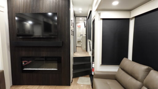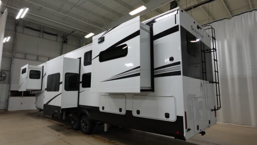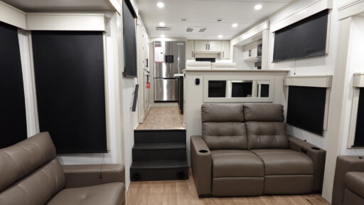 With any Solitude fifth wheel by Grand Design, you will get maximum insulation from the thermal roof design, the exclusive fully laminated walls, the triple insulated main floor, the Rail-Tite underbelly seal, the insulated gooseneck and the insulated baggage doors. The MORryde rubber pin box system utilizes a unique rubber shear spring to positively deal with rough towing and road shock, the Tire Linc TPMS system monitors pressure and temperature, and the 6-point hydraulic system allows you to setup easily. And the upgraded shower system, the hardwood window valances, the oversized kitchen pantry, the window above the master bed headboard, and the Rockford Fosgate stereo entertainment system with HDMI and App controls are a few more reasons you will love these extended-stay fifth wheels!