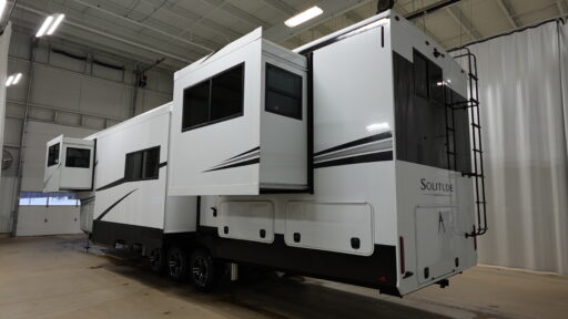Families and long-term travelers will love the rear bunk suite with its dedicated sleeping spaces, storage, and loft area—perfect for kids, guests, or even a mobile office setup. Up front, the private king bedroom offers a peaceful retreat with washer/dryer prep, wardrobe storage, and direct access to the bathroom with its oversized shower. Three power awnings extend the outdoor living space, and the massive pass-through storage ensures you can bring everything you need for extended adventures. The Solitude 414LJMJ brings together residential comfort and rugged build quality, creating one of the most complete fifth-wheel living experiences available.