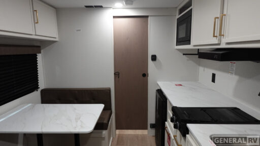 The kitchen is compact yet functional, equipped with a two-burner cooktop and a 3.3 cu ft glass front 12V refrigerator, ensuring you have everything you need to whip up your favorite meals on the road. The bathroom boasts a 24" x 32" standard shower, offering a refreshing start to your day. Enjoy the outdoors under the 10' power awning with Fusion light, perfect for evening relaxation. With 37 gallons of fresh, gray, and black water capacity, this RV is ready for extended adventures. Plus, the pass-thru storage and LP quick connect make it easy to bring along all your gear and set up camp with ease. Discover more at your nearest General RV dealership and start your journey today!