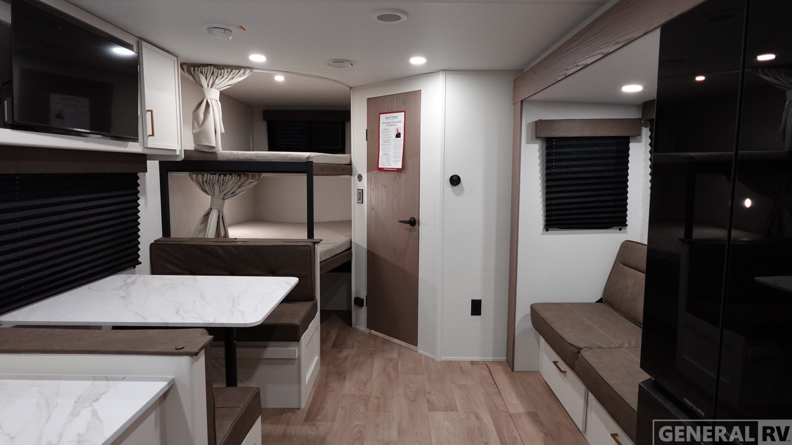 Double-Size Bunk Beds with Curtains Booth Dinette Entry Counter with Shoe Storage Queen Bed 60" Roll Over Sofa
