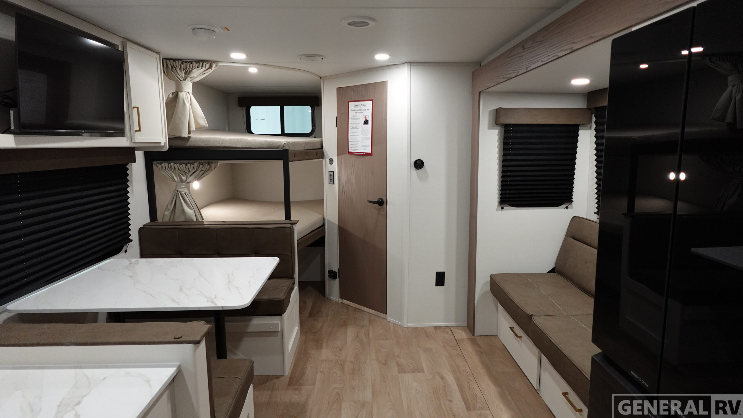 Double-Size Bunk Beds with Curtains Booth Dinette Entry Counter with Shoe Storage Queen Bed 60" Roll Over Sofa