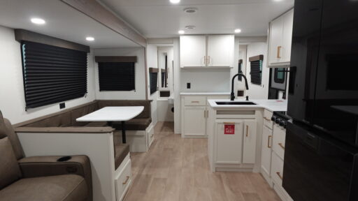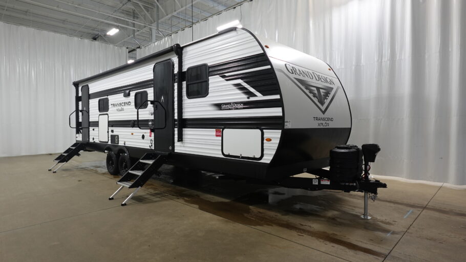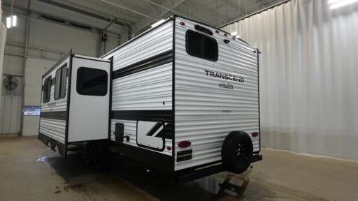 The 27DBX floorplan is crafted for convenience and versatility. The front bedroom offers a peaceful retreat with a queen bed, while the bunkhouse at the rear provides ample sleeping space with double beds. The rear bath, equipped with a shower curtain, ensures privacy and ease of use. Storage solutions are plentiful, with pass-thru storage and under-bunk options to keep your belongings organized. Whether you're embarking on a weekend getaway or an extended journey, the Grand Design Transcend Xplor 27DBX promises a seamless and enjoyable experience. For more details, visit your nearest General RV Dealership Location.