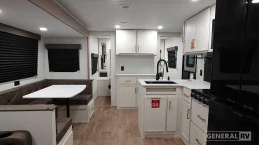 The 27DBX floorplan is crafted for convenience and versatility. The front bedroom offers a peaceful retreat with a queen bed, while the bunkhouse at the rear provides ample sleeping space with double beds. The rear bath, equipped with a shower curtain, ensures privacy and ease of use. Storage solutions are plentiful, with pass-thru storage and under-bunk options to keep your belongings organized. Whether you're embarking on a weekend getaway or an extended journey, the Grand Design Transcend Xplor 27DBX promises a seamless and enjoyable experience. For more details, visit your nearest General RV Dealership Location.