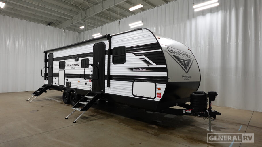 The 27DBX floorplan is crafted for convenience and versatility. The front bedroom offers a peaceful retreat with a queen bed, while the bunkhouse at the rear provides ample sleeping space with double beds. The rear bath, equipped with a shower curtain, ensures privacy and ease of use. Storage solutions are plentiful, with pass-thru storage and under-bunk options to keep your belongings organized. Whether you're embarking on a weekend getaway or an extended journey, the Grand Design Transcend Xplor 27DBX promises a seamless and enjoyable experience. For more details, visit your nearest General RV Dealership Location.