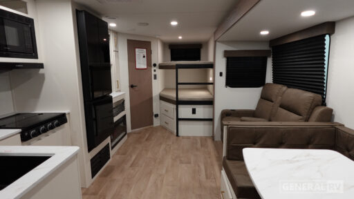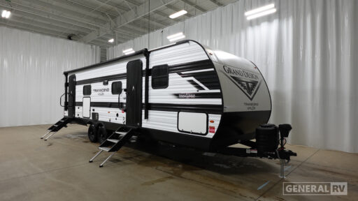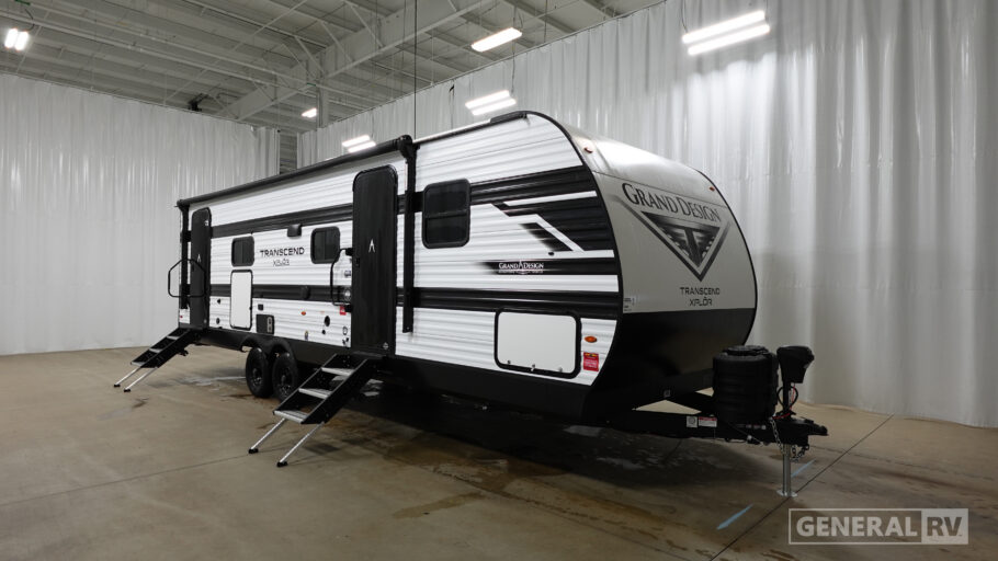 The 27DBX floorplan is crafted for convenience and versatility. The front bedroom offers a peaceful retreat with a queen bed, while the bunkhouse at the rear provides ample sleeping space with double beds. The rear bath, equipped with a shower curtain, ensures privacy and ease of use. Storage solutions are plentiful, with pass-thru storage and under-bunk options to keep your belongings organized. Whether you're embarking on a weekend getaway or an extended journey, the Grand Design Transcend Xplor 27DBX promises a seamless and enjoyable experience. For more details, visit your nearest General RV Dealership Location.