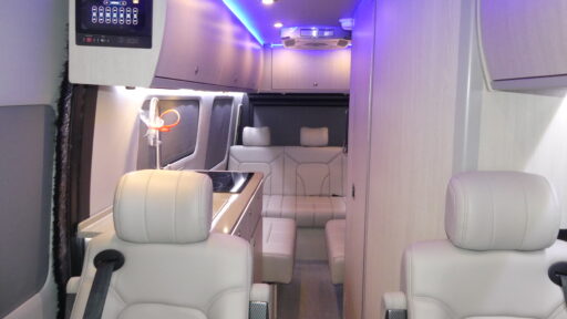 Whether you travel to see mountains, beaches or friends, this coach will provide all the luxury and functionality you will want while on the road! There are two captain's chairs plus two additional chairs right behind with a table to dine at once at your destination. You will find additional seatbelts in the rear seating when you plan a trip for everyone to tailgate at the big game, listen to music at a festival, or watch a club sport in another city. When you need to sleep two, the power sofa bed offers just that, and the private enclosed wet bath also includes a window and privacy shade. The cook can make meals using the galley kitchen with a farmhouse-style sink, combo microwave/convection/air fryer and a two-burner induction cooktop.