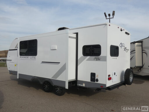 The 225CK’s thoughtful design extends to its rear bath, where you'll find ample storage and a practical shower with a curtain. With a 19-foot powered retractable awning, you can effortlessly extend your living space to the great outdoors, perfect for enjoying sunny days and starry nights. The trailer's robust construction, including dual axles and a dry weight of 5,120 lbs, ensures a smooth and stable ride. With a fresh water capacity of 45 gallons and generous storage throughout, this RV is ready for anything from weekend getaways to extended road trips. For more details, visit your nearest General RV Dealership Location.