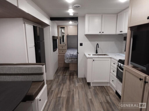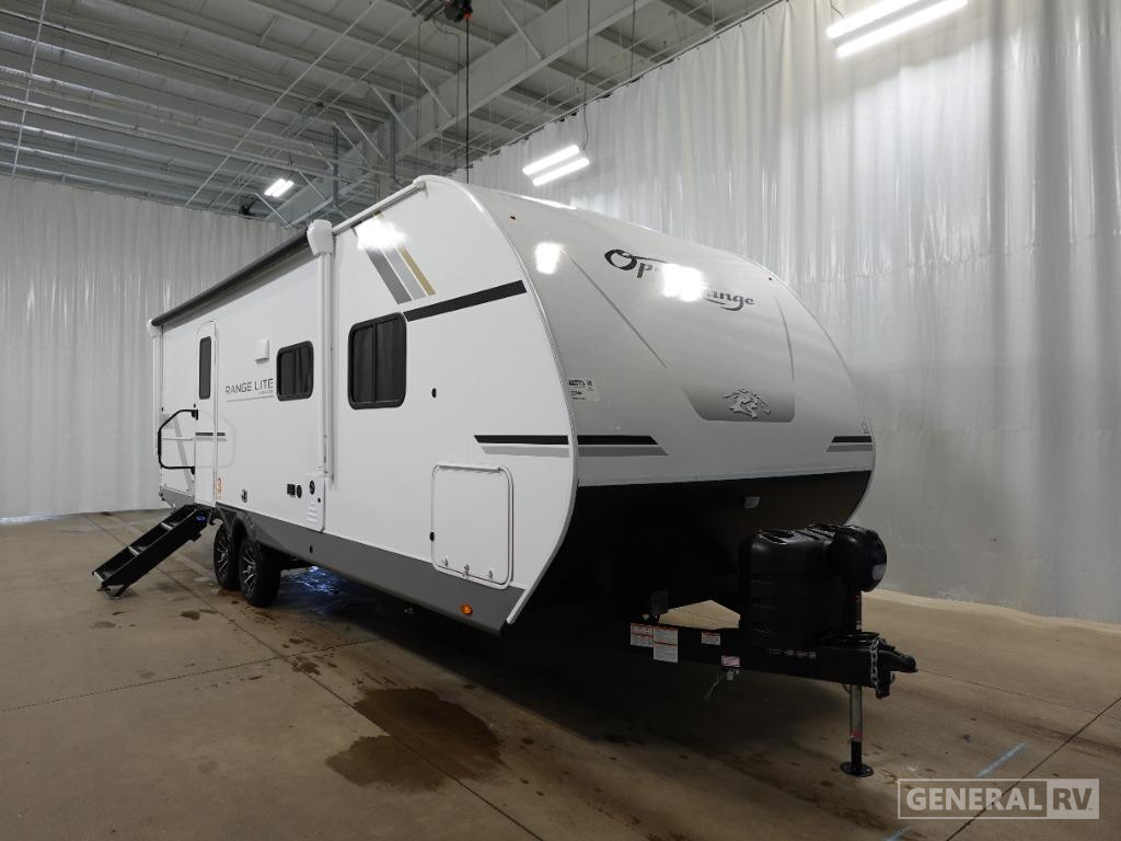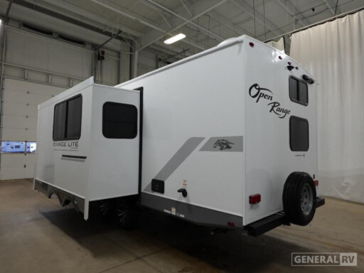 One of the standout features is the outside kitchen, complete with exterior refrigerator and prep space, making outdoor cooking easy and keeping the interior clean. Additional exterior conveniences include an 18-foot power awning, exterior storage compartments, and a centralized utility docking station. With its efficient layout, generous sleeping capacity, and lightweight construction, the Range Lite 241BH is an excellent option for families looking for comfort, storage, and versatility in a travel trailer that’s easy to tow.
