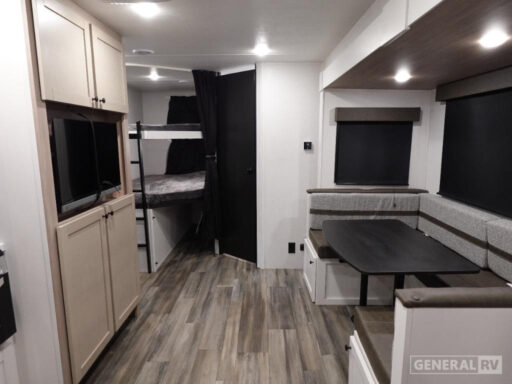 Moving into the main living area, you’ll find a bright and open space anchored by a large U-shaped dinette, ideal for meals, game nights, or relaxing indoors. The dinette easily converts into additional sleeping space when needed. Across from the dinette is the entertainment center, positioned for comfortable viewing from the seating area. The kitchen is centrally located and designed for efficiency, featuring a refrigerator, microwave, cooktop, pantry storage, and ample overhead cabinets—everything you need to prepare meals on the road. At the rear of the trailer, the bunkhouse layout is perfect for kids or guests, offering double-over-double bunk beds with integrated storage under the lower bunk. This area also includes direct access to the rear bathroom, which features a tub/shower combination, toilet, vanity, and medicine cabinet—ideal for families with children.