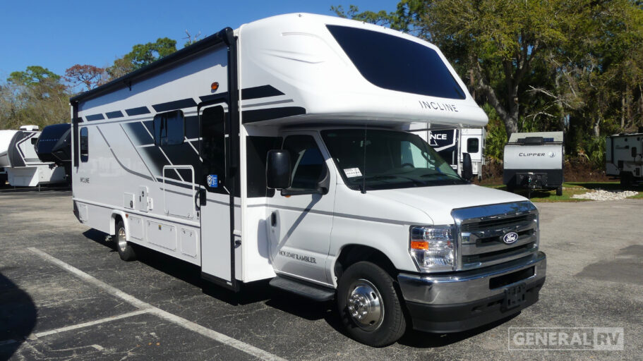 With any Incline Class C gas motorhome by Holiday Rambler, you will enjoy unrivaled performance, unbeatable storage, and luxury at every turn! You will love the journey just as much as the destination with reclining back and swivel captain's chairs and side view cameras, plus there is a Ford 7.3L V8 engine for power you can feel. Each model features painted steel frame construction with a Powerlock System ll that interlocks the walls to the roof for added durability, along with Vacu-Bond aluminum framed sidewalls, roof, and floor. Outside, you'll find automatic hydraulic leveling jacks, patio lighting, slam latch luggage door handles, and a Winegard Air 360+ that will allow you to stay connected as you travel. Head inside to find Surf-X countertops, slide out fascia with coordinating interior wood color, hidden hinge cabinet doors, kitchen backsplash, and many more comforts!