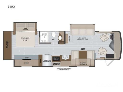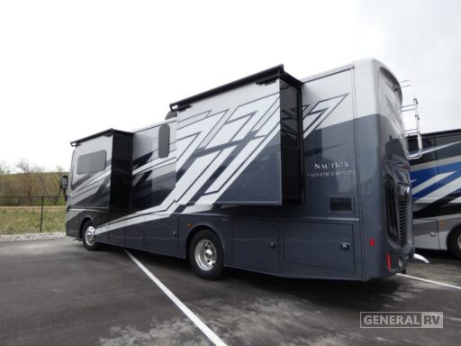 The Nautica 34RX boasts a well-appointed center kitchen, complete with a residential refrigerator and induction cooktop, perfect for crafting gourmet meals on the go. The rear bedroom is a sanctuary of relaxation, featuring an Encore Series King bed with plenty of storage options to keep your belongings organized. Enjoy the convenience of a center bath with a stylish shower, and appreciate the thoughtful design that includes washer and dryer prep for added ease. With an 18-foot powered retractable awning, you can extend your living space outdoors, creating the perfect setting for alfresco dining or simply soaking in the scenery. Discover the ultimate in RV living with the Holiday Rambler Nautica 34RX, and start your journey at your nearest General RV dealership.