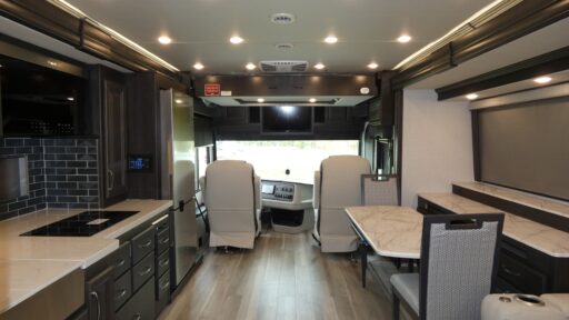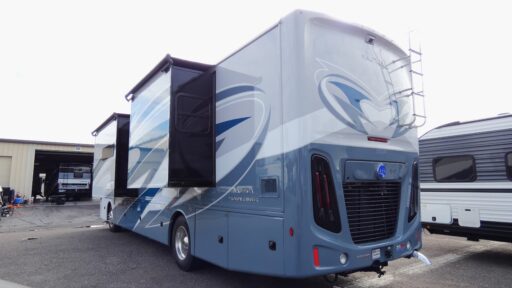 The Nautica 37S is powered by a robust Cummins® 6.7L, 340HP engine, resting on the reliable TITAN BRIDGE® Freightliner® Custom Chassis. Its diesel fuel capacity of 100 gallons ensures you can journey further without frequent stops. The residential-style kitchen is equipped with an induction cooktop and a convection microwave, making meal preparation a delight. For those who love to entertain outdoors, the exterior entertainment center with an LED TV is a fantastic feature. With a fresh water capacity of 96 gallons and ample storage throughout, this RV is ready for extended stays off the grid.