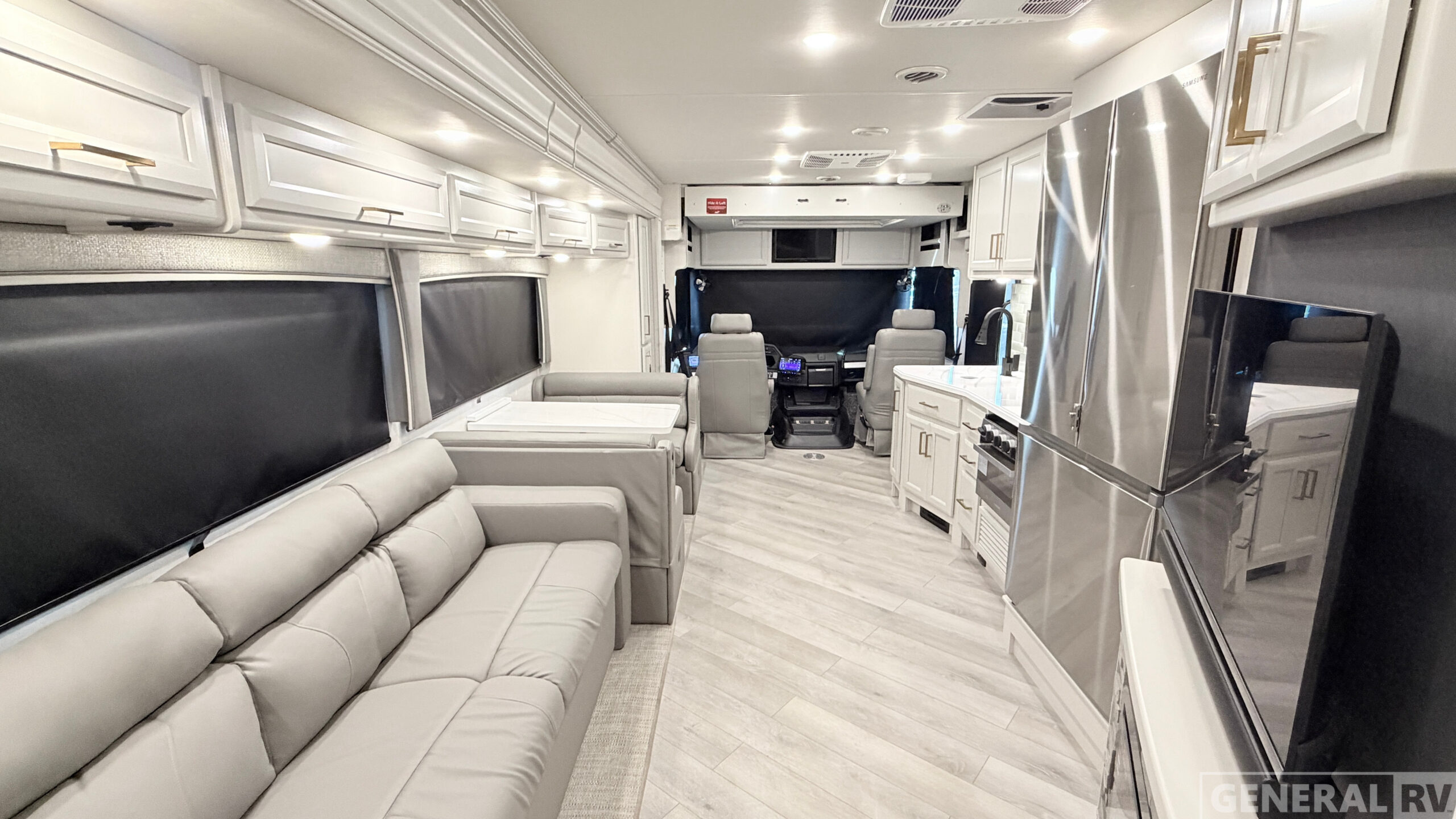 Jack-Knife Sofa Driver/Passenger Pedestal Table Convection Microwave Exterior LED TV Dual Bedroom Wardrobes