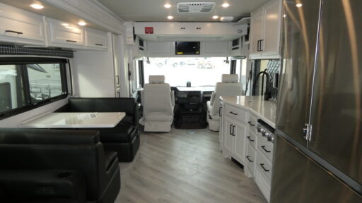 The thoughtful bath-and-a-half floorplan provides convenience for families and guests, while the master bedroom offers a sumptuous king-sized bed for ultimate comfort. The main living area features a convertible booth dinette and premium entertainment options both inside and outside the vehicle. Culinary enthusiasts will appreciate the residential refrigerator and three-burner cooktop, making meal preparation a breeze while traveling. Modern amenities including dual A/C units, automated leveling system, and a 100W solar panel ensure comfort regardless of your destination. The premium Vetrosina fiberglass exterior and Powerlock construction system provide durability and peace of mind for years of adventure. To experience the ultimate in mobile luxury, visit your nearest General RV dealership and discover why the Vacationer 35K continues to set the standard for Class A motorhomes.