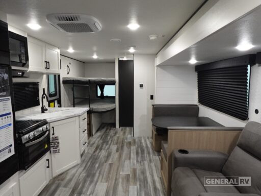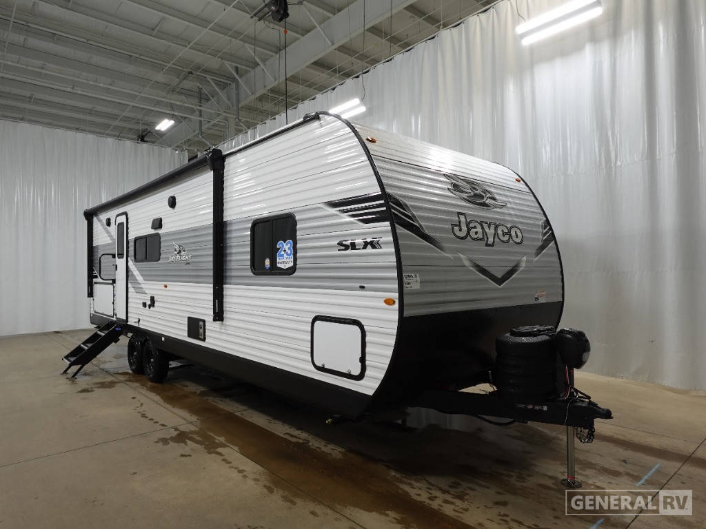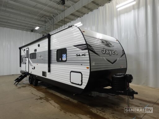 The thoughtful layout includes a rear bath with a plastic/glass shower, ensuring convenience and privacy. Outside, the 20-foot powered retractable awning creates a perfect shaded area for outdoor enjoyment, while the exterior kitchen setup enhances your camping experience. With a generous fresh water capacity of 76 gallons and ample storage throughout, this RV is ready to support all your adventures. Whether you're heading to the mountains or the beach, the Jay Flight SLX 263BHS promises a delightful blend of style and functionality. For more information, visit your nearest General RV dealership.
