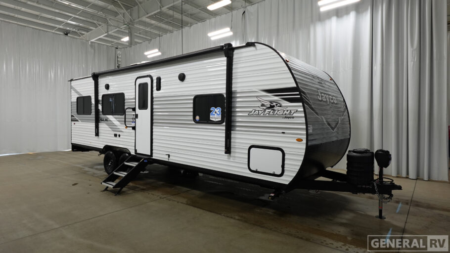 The Jayco Jay Flight SLX toy hauler travel trailer is quite easy to own because it is lightweight for an easier towing experience. Built on a fully integrated A-frame with galvanized-steel, impact-resistant wheel wells, the Jay Flight SLX has quality at its very foundation. That quality continues on to the electric self-adjusting brakes, easy-lube hubs, Magnum Truss roof system, and LP quick connect. Some of what the mandatory Customer Value Package includes is backup camera prep, Keyed-Alike entry and baggage doors, and an on-demand tankless water heater.
