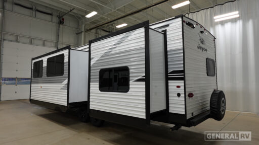 The Jayco Jay Flight SLX travel trailer is quite easy to own because it is lightweight for an easier towing experience. Built on a fully integrated A-frame with galvanized-steel, impact-resistant wheel wells, the Jay Flight SLX has quality at its very foundation. That quality continues on to the electric self-adjusting brakes, easy-lube hubs, Magnum Truss roof system, and LP quick connect. Some of what the mandatory Customer Value Package includes is backup camera prep, Keyed-Alike entry and baggage doors, marine grade exterior speakers, and an on-demand tankless water heater.